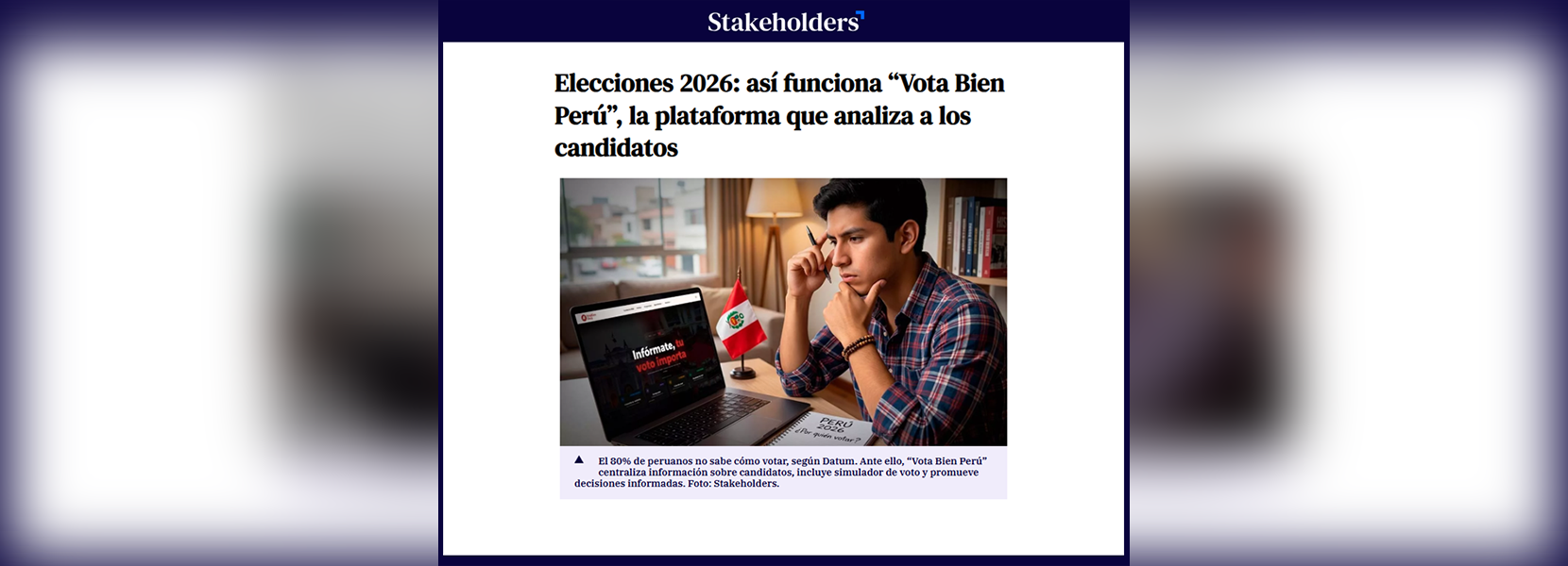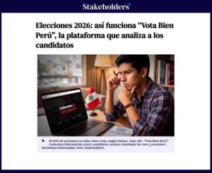Angelina Falla, estudiante de la carrera de Ciencia Política de la Universidad Antonio Ruiz de Montoya (UARM), participó en un informe de la Revista Stakeholders. En su intervención, informó Vota Bien Perú, una informa interactiva para analizar los candidatos de cara a las próximas elecciones 2026.