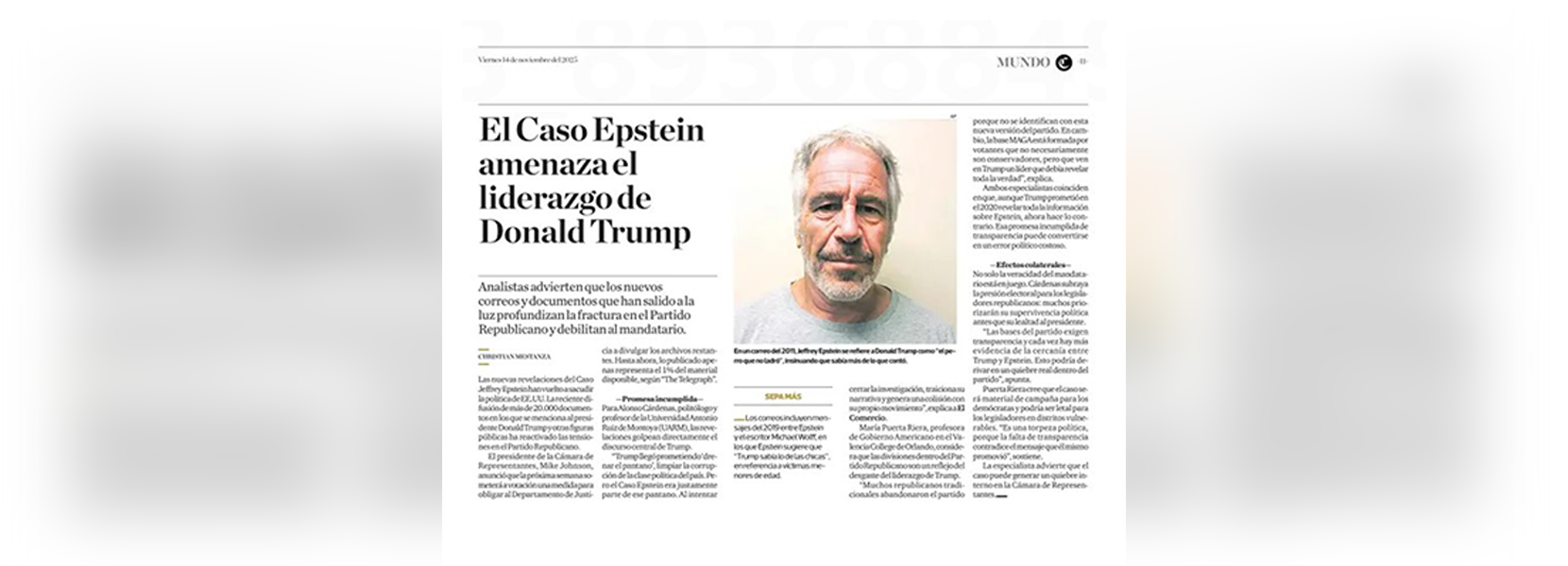 El politólogo de la UARM señaló que Trump construyó su liderazgo sobre la promesa de combatir la corrupción en la clase política. Sin embargo, recordó que el caso Epstein reflejaba justamente ese tipo de irregularidades. Por ello, advirtió que cualquier intento de interferir o limitar la investigación contradice su discurso de transparencia y puede erosionar la confianza de su propia base política.