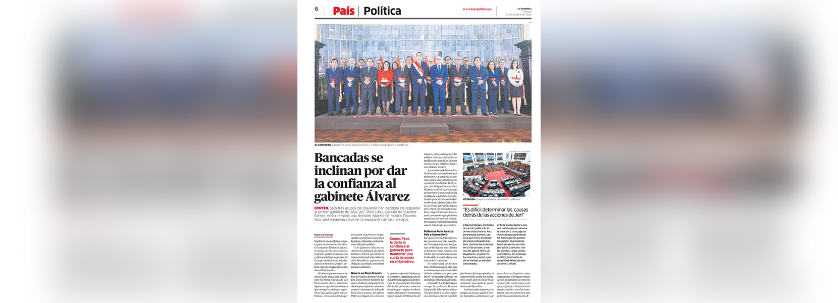 Marisol Vargas, docente de la carrera de Ciencia Política de la Universidad Antonio Ruiz de Montoya (UARM), participó en un informe de La República. En su intervención, analizó el gabinete Álvarez y los primeros días de mandato de José Jerí.