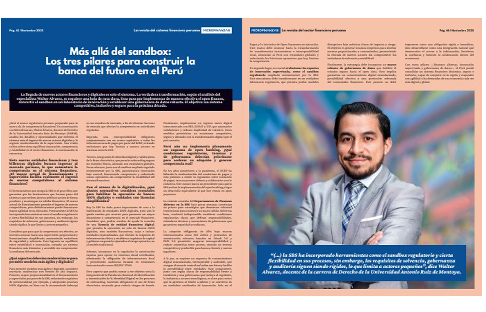 Walter Alvarez, docente de la carrera de Derecho de la Universidad Antonio Ruiz de Montoya (UARM), participó en una entrevista de la revista Microfinanzas. Durante su intervención, analizó el futuro de la banca en el Perú.