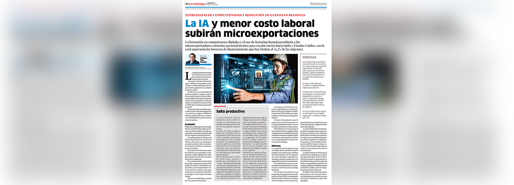 Mario Roncal, jefe de la carrera de Negocios Internacionales y Logística de la Universidad Antonio Ruiz de Montoya (UARM), participó en un informe de El Peruano. En su intervención, analizó el avance de las microempresas en las exportaciones, que representan el 70% de las organizaciones en este rubro.