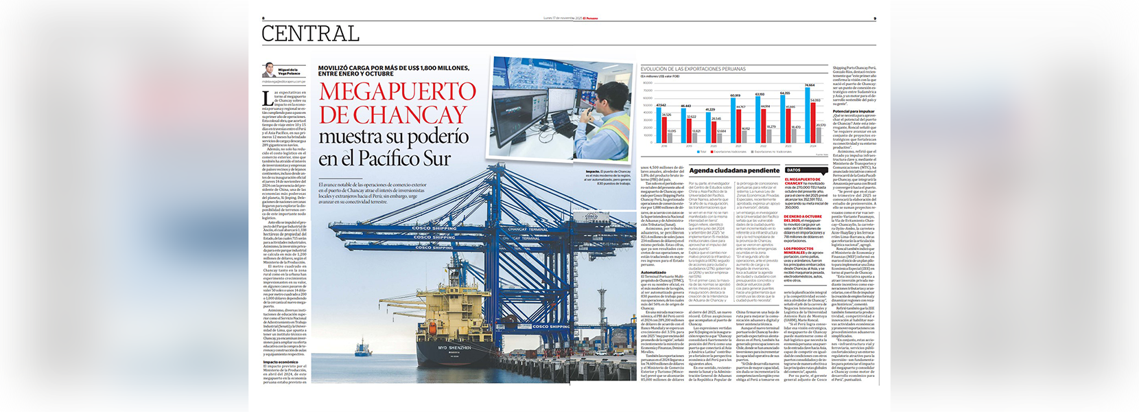 Mario Roncal, jefe de la carrera de Negocios Internacionales y Logística de la Universidad Antonio Ruiz de Montoya (UARM), participó en un informe de El Peruano. En su intervención, analizó los avances y desafíos del megapuerto de Chancay, a un año de su inauguración.