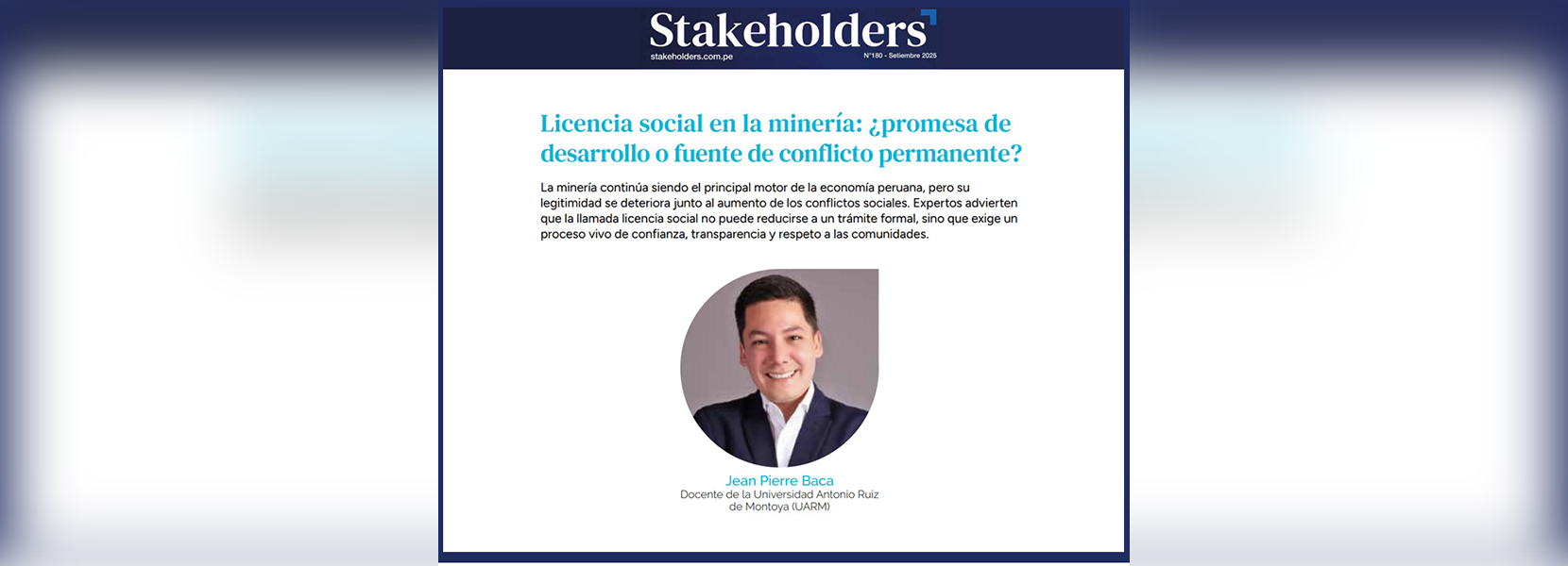 Jean Pierre Baca, docente de Diplomado en Gestión Social para la Promoción y Sostenibilidad de Actividades Extractivas de la Escuela de Posgrado UARM, participó en un informe en la Revista Stakeholders. Analizó la importancia de la licencia social en la minería.