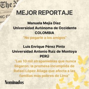 El reportaje “Las 10 mil atrapanieblas que nunca llegaron: la promesa incumplida de Rafael López Aliaga que afecta a las familias más pobres de Lima”, elaborado por estudiantes de la Carrera de Periodismo de la Universidad Antonio Ruiz de Montoya (UARM), fue nominado al Premio Te Muestra, certamen organizado por la Universidad del Quindío en Colombia, que reconoce lo mejor del periodismo universitario latinoamericano.